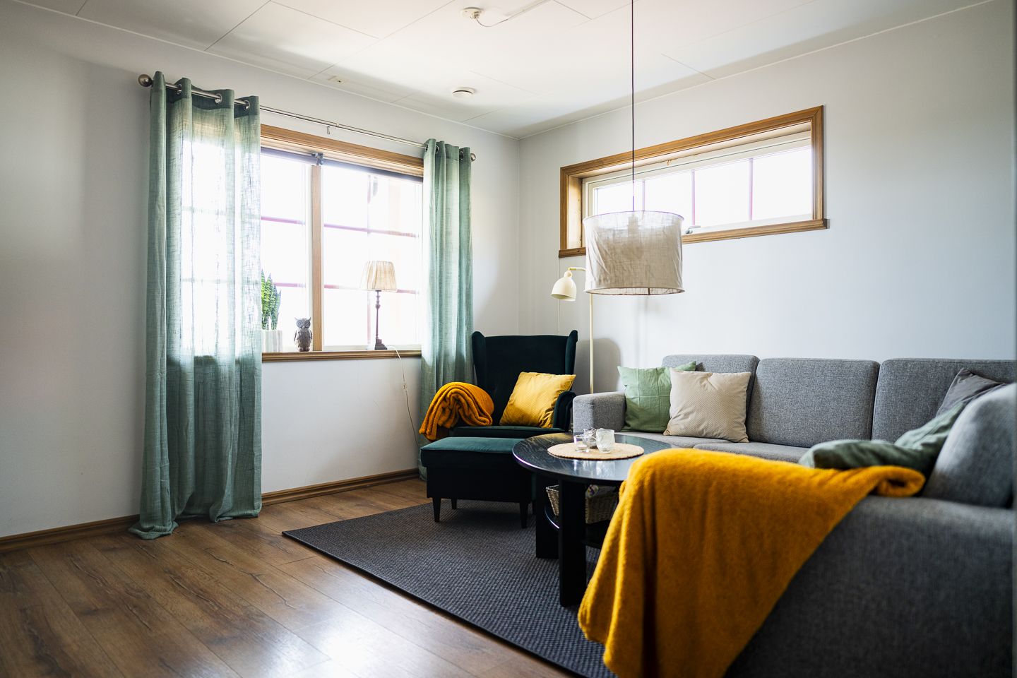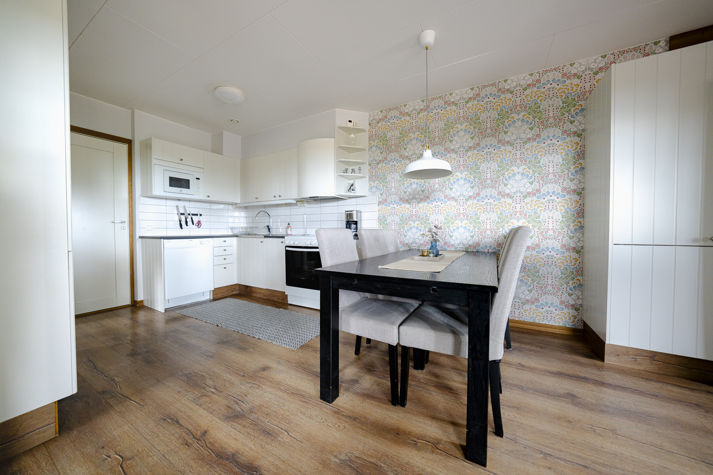 Köket är välutrustat för semesterens alla måltider 🍽️ och vardagsrummet har matplats, sittgrupp och TV. Badrum med dusch, torkskåp och motorvärmaruttag finns.